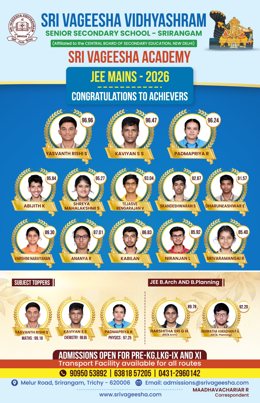 Welcome to Sri Vageesha Vidhyashram Senior Secondary CBSE School! We would like to extend a hearty welcome to all of you, both students and parents. Hopefully, your child will find this coming year to be both exciting and challenging as he/she explores a variety of new learning experiences.
